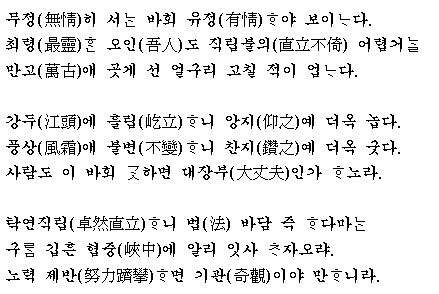 ÀÌ ÀÛǰÀº ÀÛÀÚÀÇ ¹®ÁýÀÎ <³ë°èÁý> ±Ç3¿¡ 'ÀԾϰ¡ 22Àå'À̶ó´Â Á¦¸ñÀÇ ¿¬½ÃÁ¶ Áß Ã¹ Æí 'ÀÔ¾Ï' 3¼öÀÌ´Ù. Á¦¸ñÀÇ Çà°£ ÁÖ¸¦ º¸¸é "ÀÌ ¶§ ¿©Çå ¼±»ý(ÀåÇö±¤)ÀÌ º» ±ºÀÇ ºÏÂÊ¿¡ ÀÖ´Â ÀԾϿ¡ Àá½Ã ¸Ó¹°·¯ °è¼Ì´Ù. °ø(¹ÚÀηÎ)²²¼ ÀÏÂïÀÌ ¼±»ýÀ» µû¶ó ³ë´Ò¾ú´Âµ¥, ¿©Çå ¼±»ýÀ» ´ë½ÅÇÏ¿© ÀÌ ³ë·¡¸¦ ÁöÀ¸¼Ì´Ù."¶ó°í µÇ¾î ÀÖ´Ù. ¿©ÇåÀÇ ¿¬º¸¿¡ µû¸£¸é "1637³â °Ü¿ï, (º´ÀÚÈ£¶õÀÇ) Ç׺¹ ¼Ò½ÄÀ» µè°í ÀÔ¾ÏÃÌ¿¡ µé¾î°¡ »ì´Ù."¶ó µÇ¾î ÀÖÀ¸¹Ç·Î, ÀÌ ³ë·¡´Â ÀÌ ¶§ Áö¾îÁø °ÍÀ¸·Î º¼ ¼ö ÀÖ´Ù. ¹«Á¤¹°ÀÎ ¹ÙÀ§¿¡ ÀΰÝÀ» ºÎ¿©Çϰí, °æ°üÀÇ ¾Æ¸§´Ù¿òÀ» ¿¹ÂùÇÑ µ¥ ¸Ó¹«¸£Áö ¾Ê°í À̸¦ ´Ù½Ã Çй®¿¡ ºø´ë¾î ³ë·¡Çϰí ÀÖ´Â °ÍÀÌ Æ¯Â¡ÀÌ´Ù. |